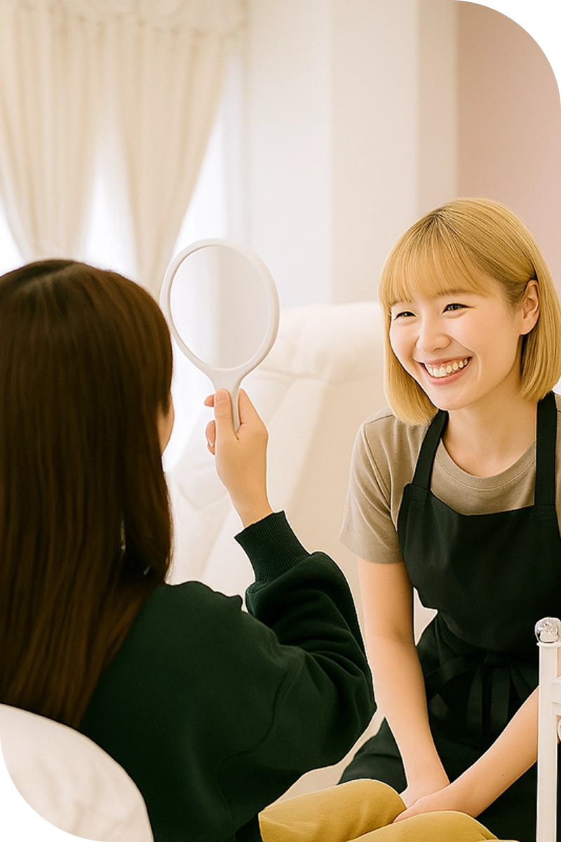 まつ毛パーマ・さくらカール施術(未経験から習得可能) 受付・予約対応・お会計・カウンセリング サロン内の清掃や備品管理 SNS投稿による情報発信 |
